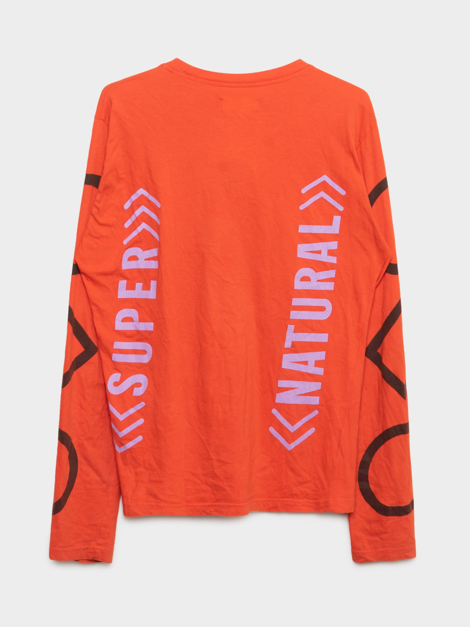 A bright burnt orange longsleeve tee from Walter Van Beirondonck that features a black tribal face