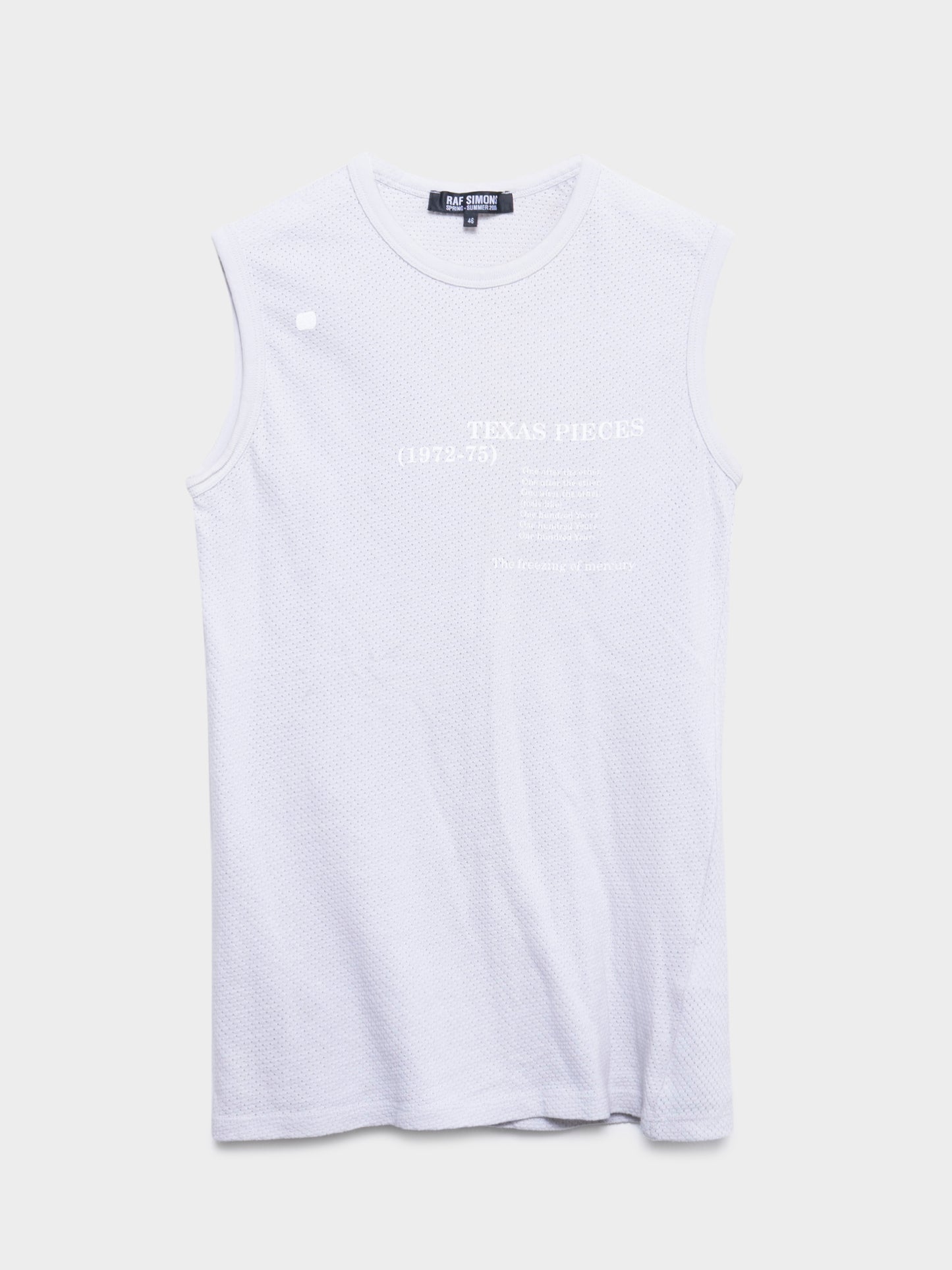 From Raf Simons' SS05 collection comes this lightweight mesh tank top with some tonal text on the front.