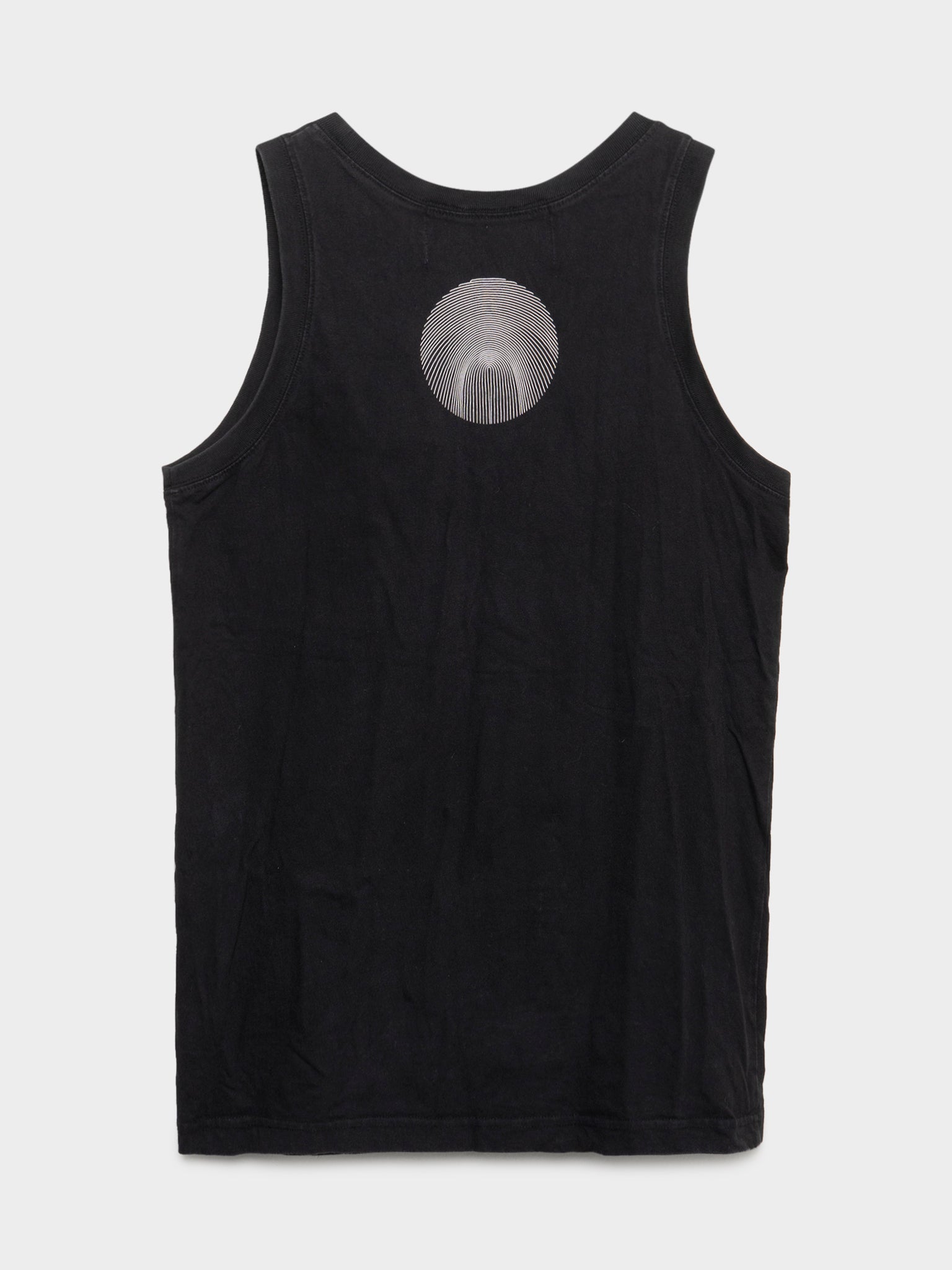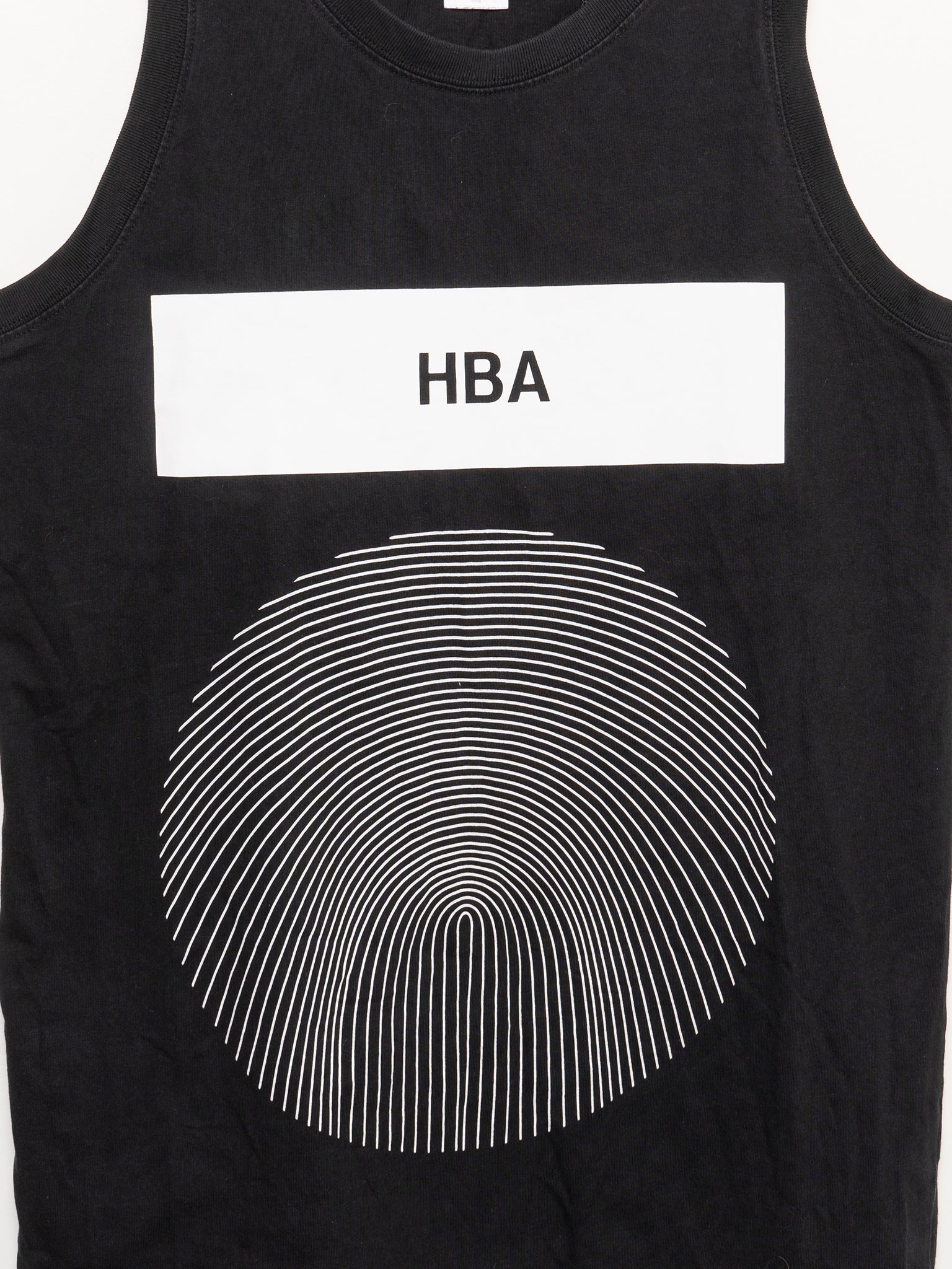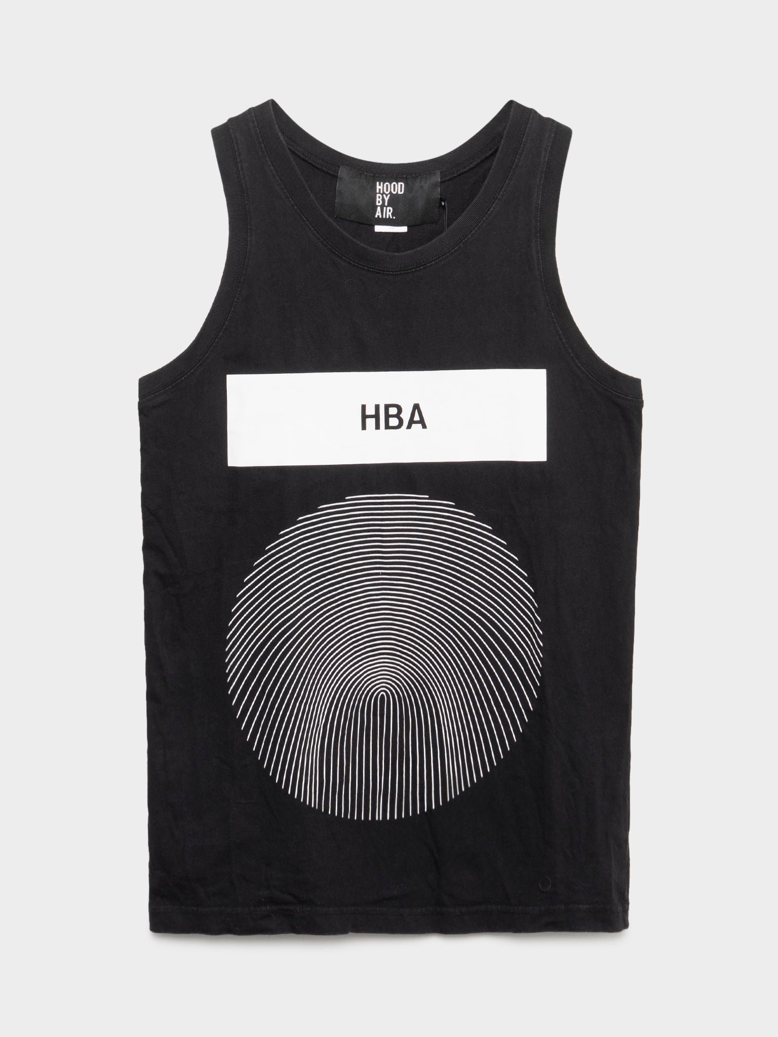 A black Hood By Air tank top that features a round thumbtack logo on the front and back