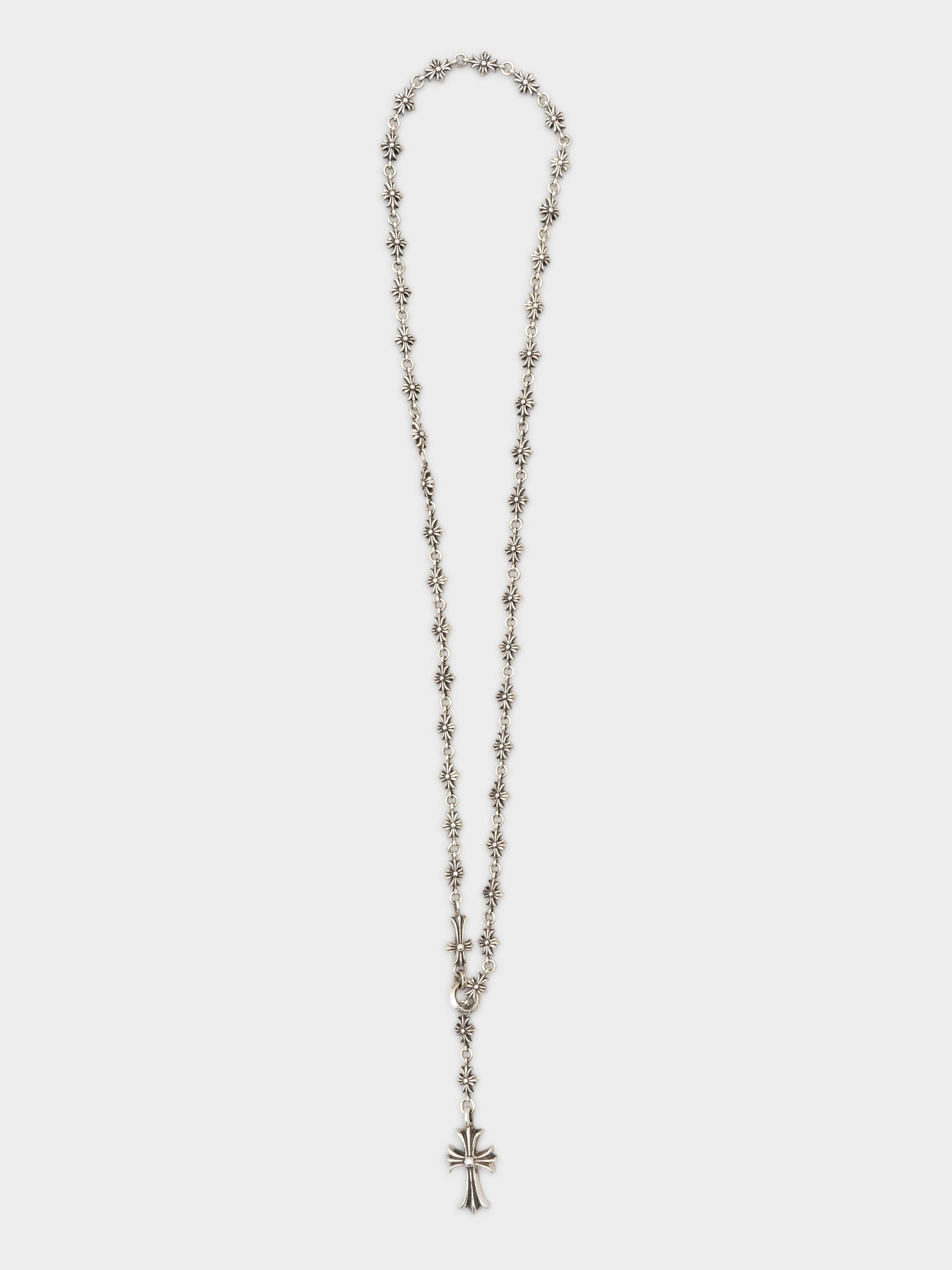 An exceedingly rare Chrome Hearts rosary necklace made of tiny e crosses linked together with one larger tiny fat cross pendant at the bottom and a baby fat cross in the middle.