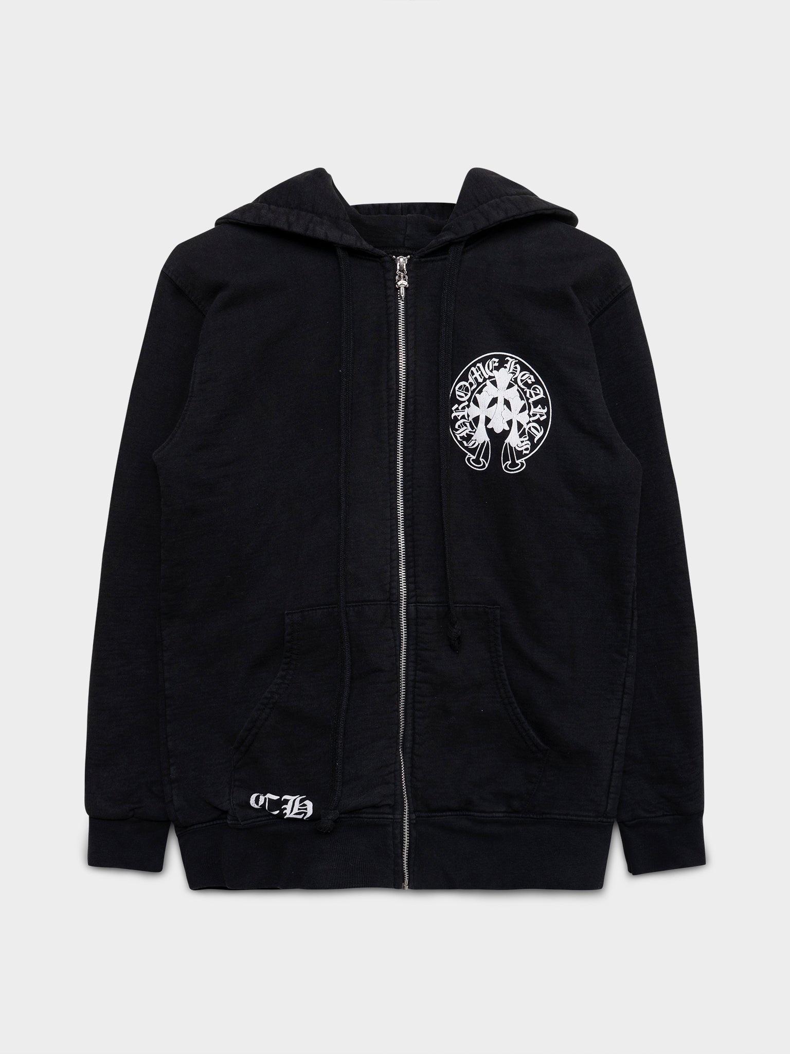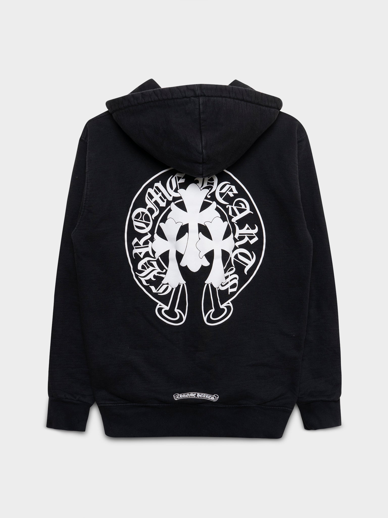 A black zip up Chrome Hearts hoodie with large triple cross design on the back.