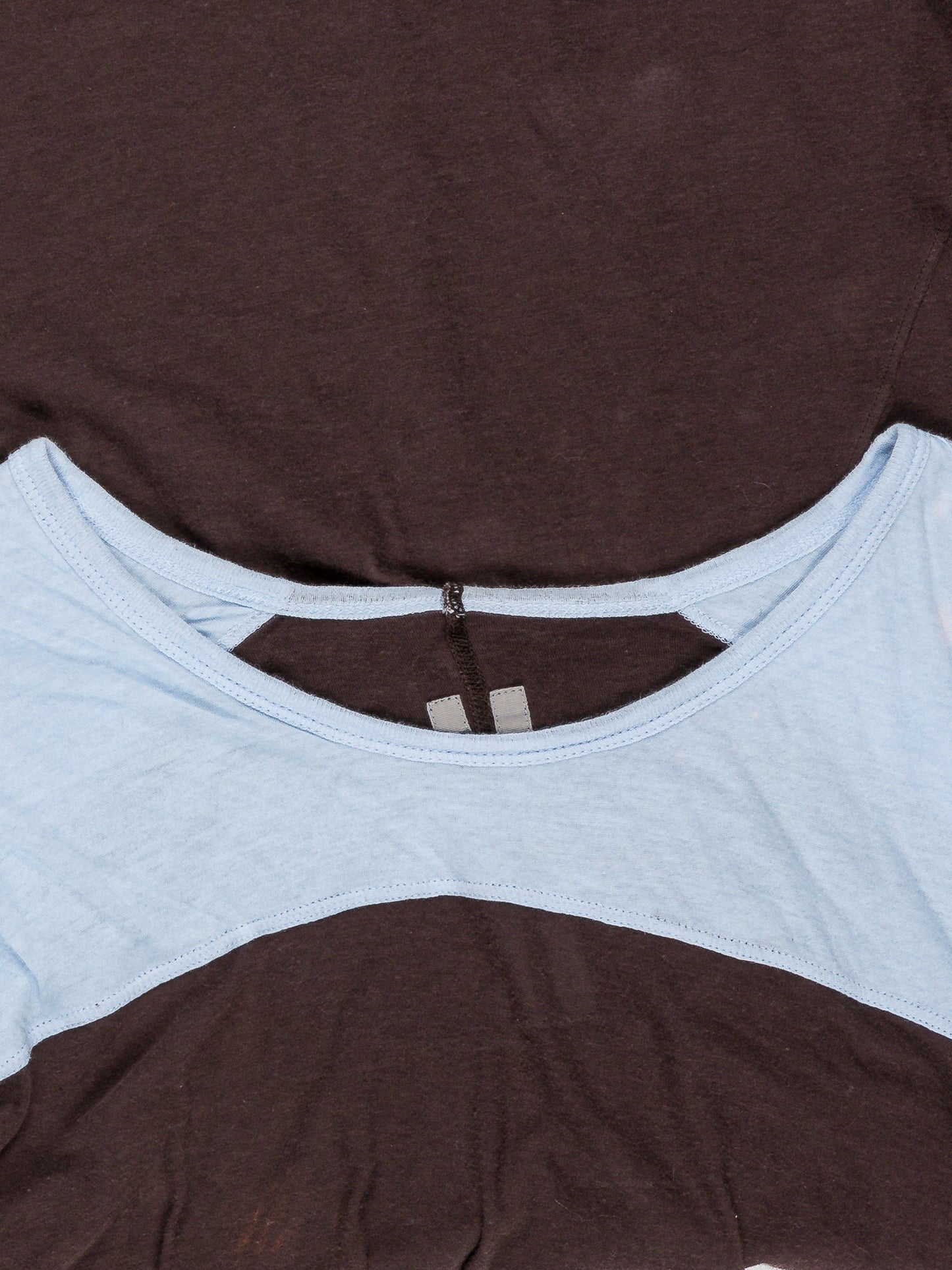 A comfortable long sleeve t-shirt from Rick Owens in his classic layering fabric that is two tone between sky blue and a deep maroon.